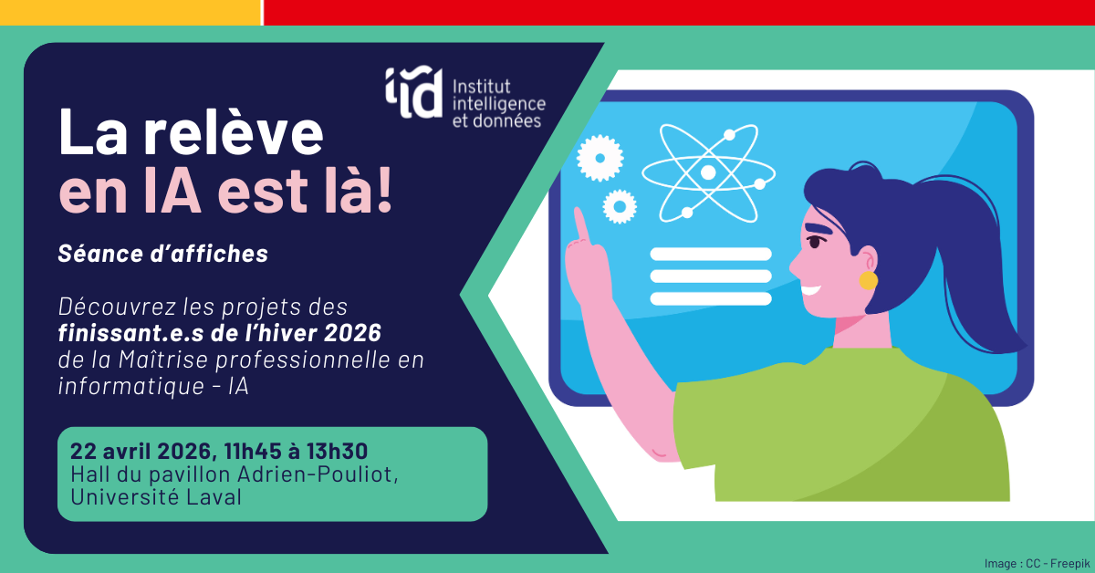 Sous forme de séance d’affiches et de présentations en continu, venez à la rencontre des personnes finissantes – hiver 2026 de la maîtrise professionnelle en informatique – intelligence artificielle offerte à la Faculté des sciences et de génie de l’Université Laval.