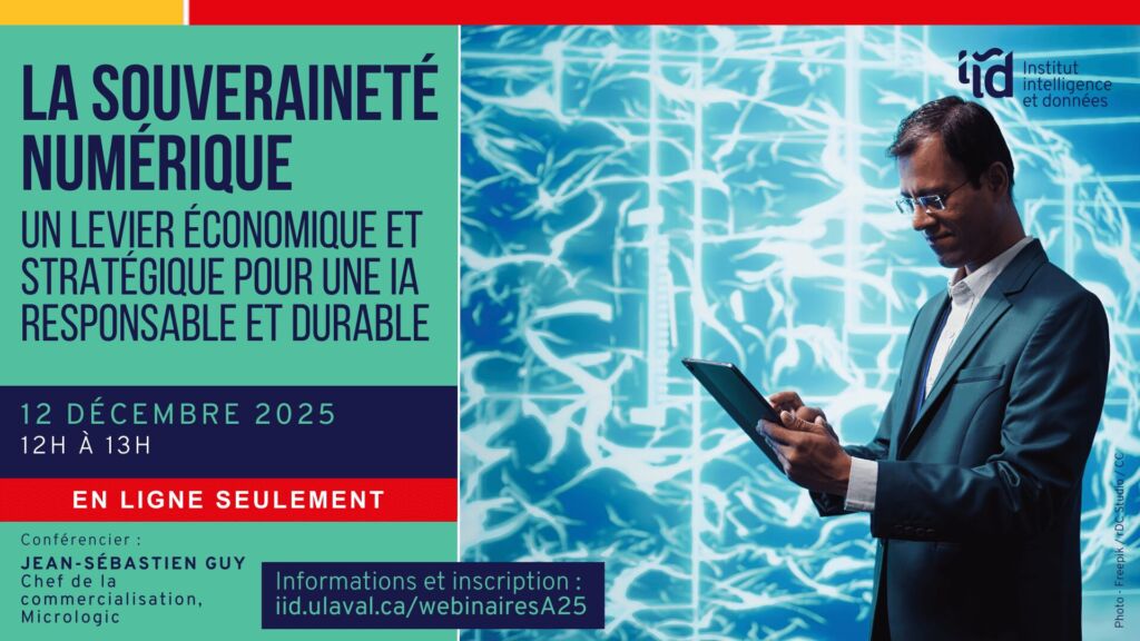Entre le 26 septembre et le 12 décembre 2025, c’est trois webinaires qui seront présentés par l’Institut intelligence et données (IID) de l’Université Laval dans le cadre de sa programmation régulière pour la saison d’automne 2025, qui s’intéressera de façon toute particulière aux enjeux de souverainetés ou aux défis liés à la prise de décision par intelligence artificielle.